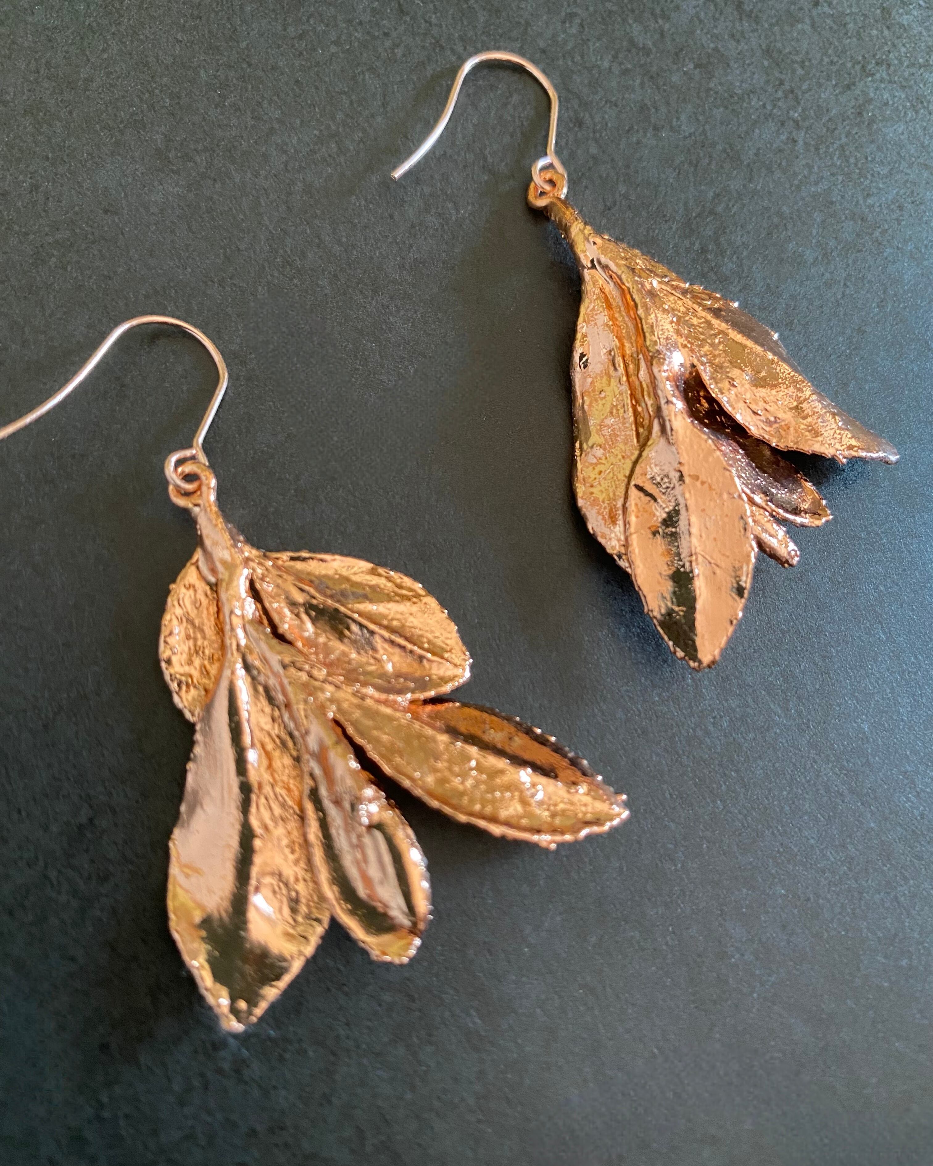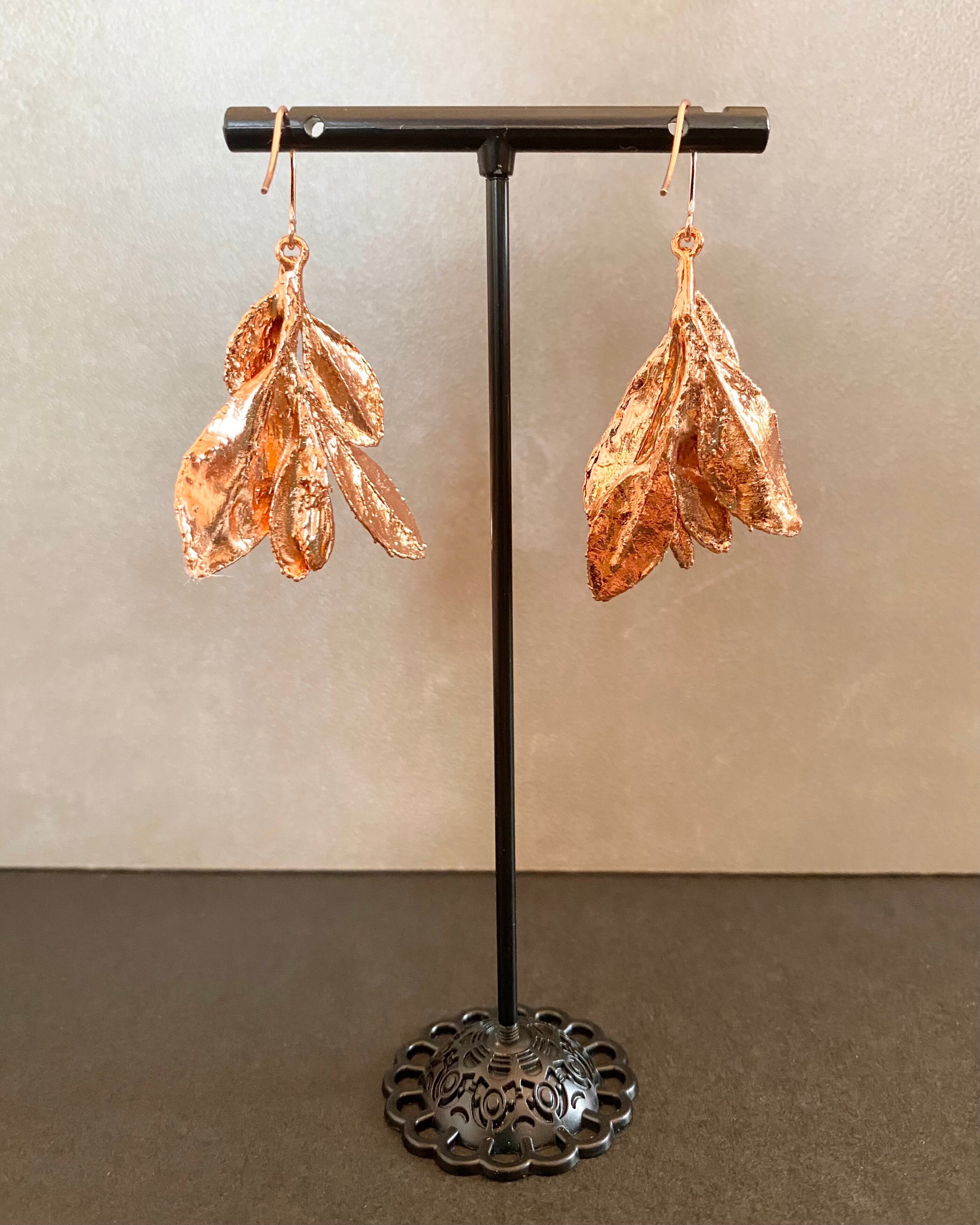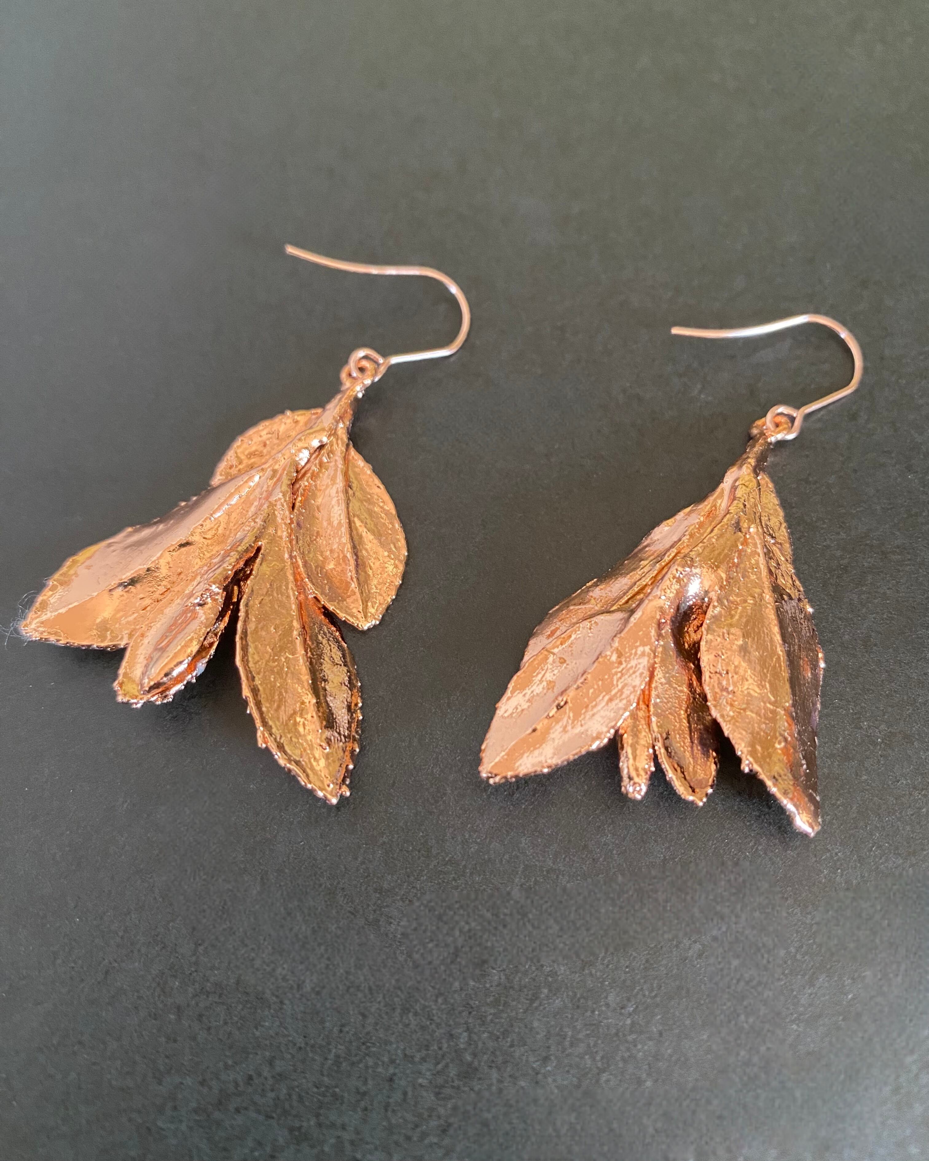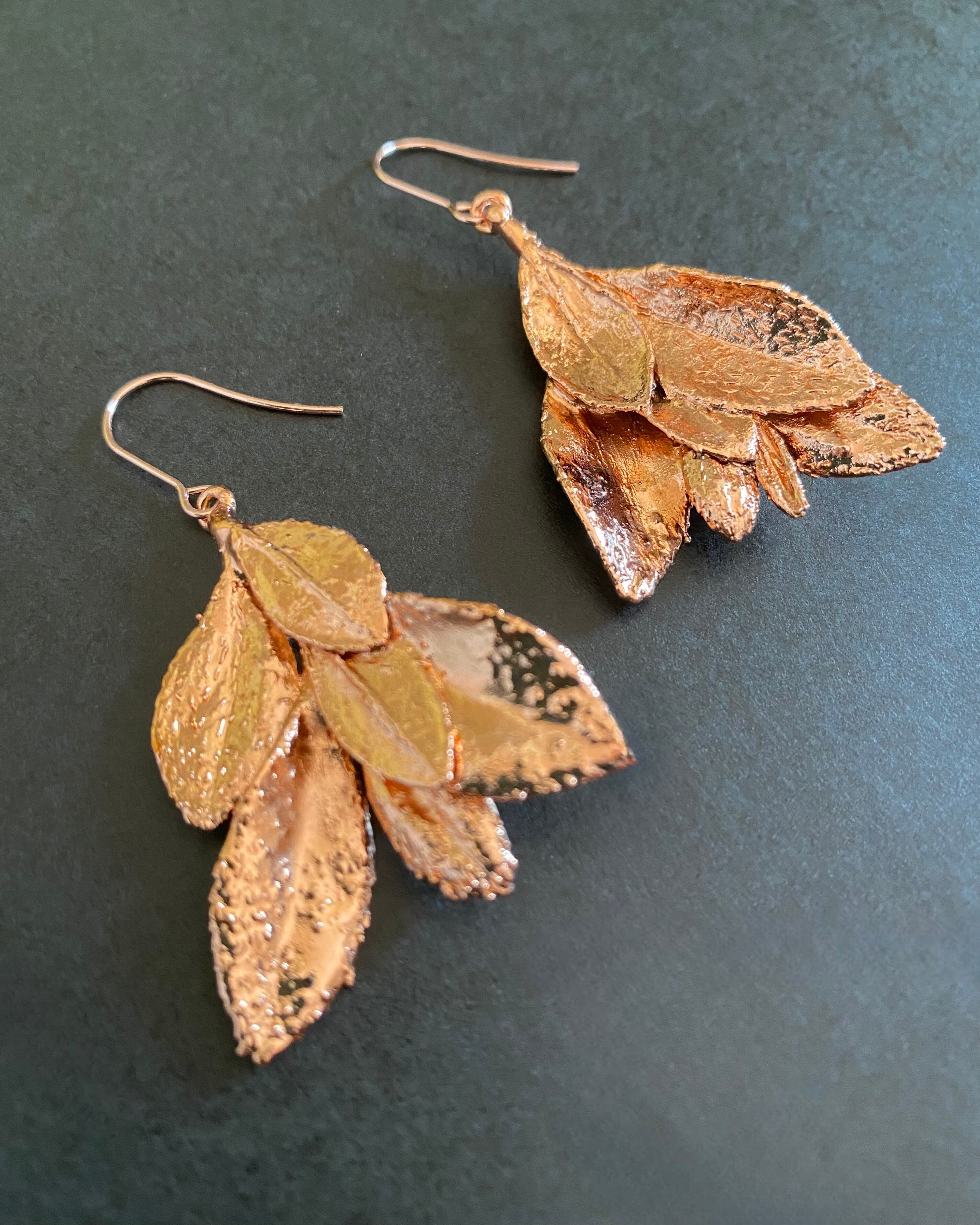 いく重にも折り重なるサツキの葉に、あたたかみのある銅のコーティングしたピアスです。