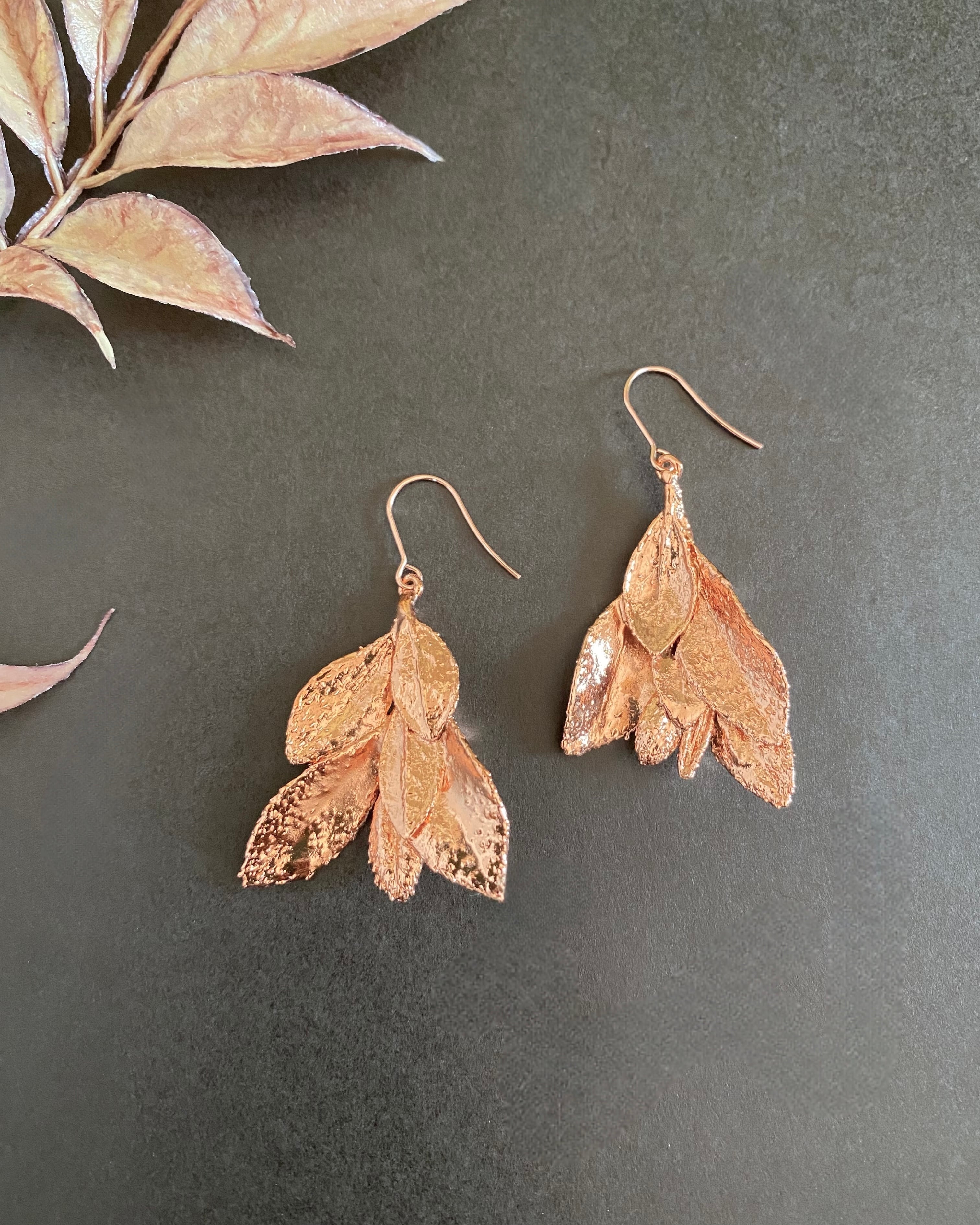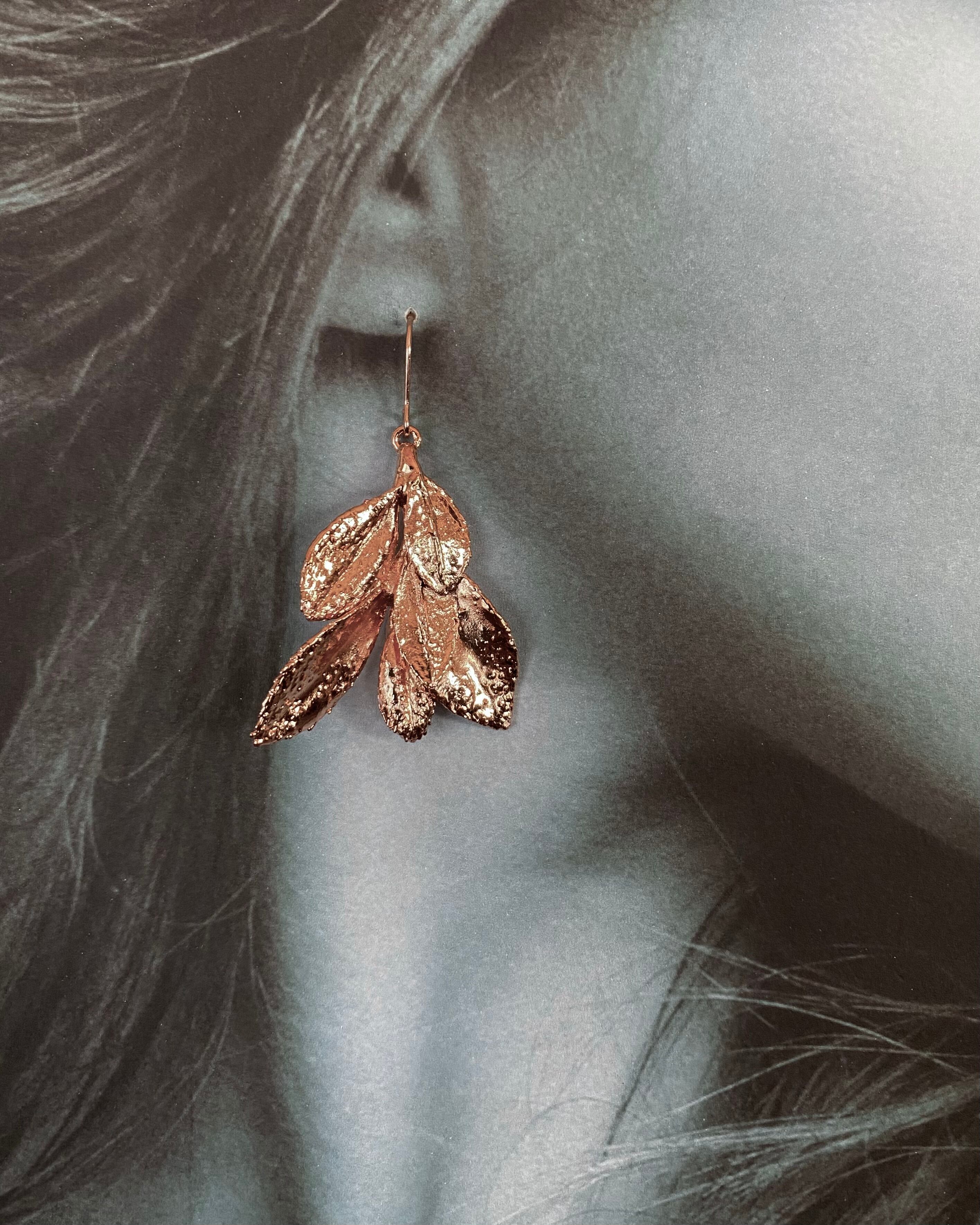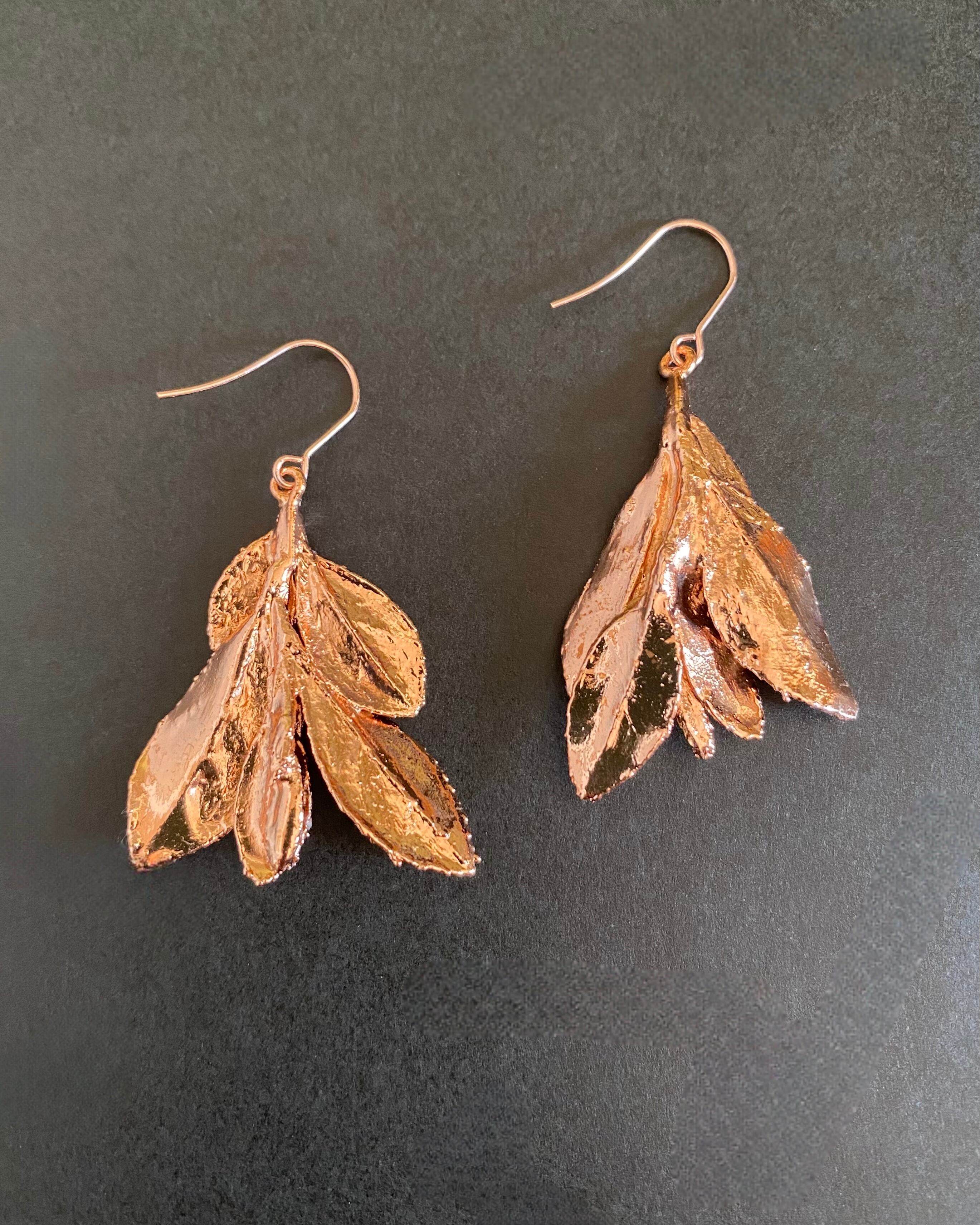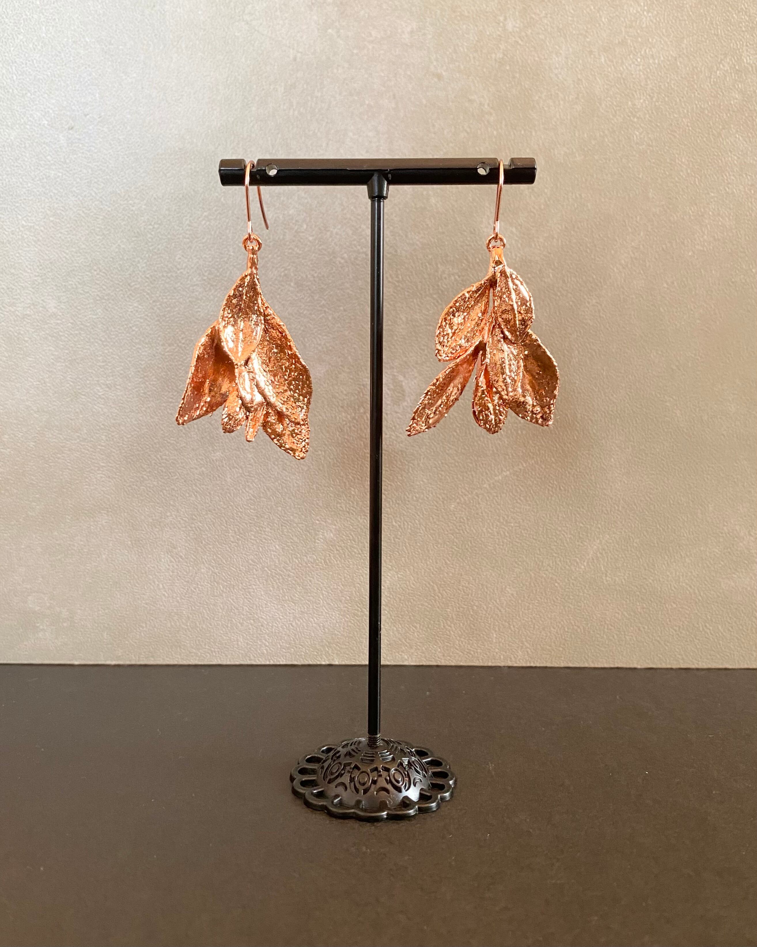 いく重にも折り重なるサツキの葉に、あたたかみのある銅のコーティングしたピアスです。