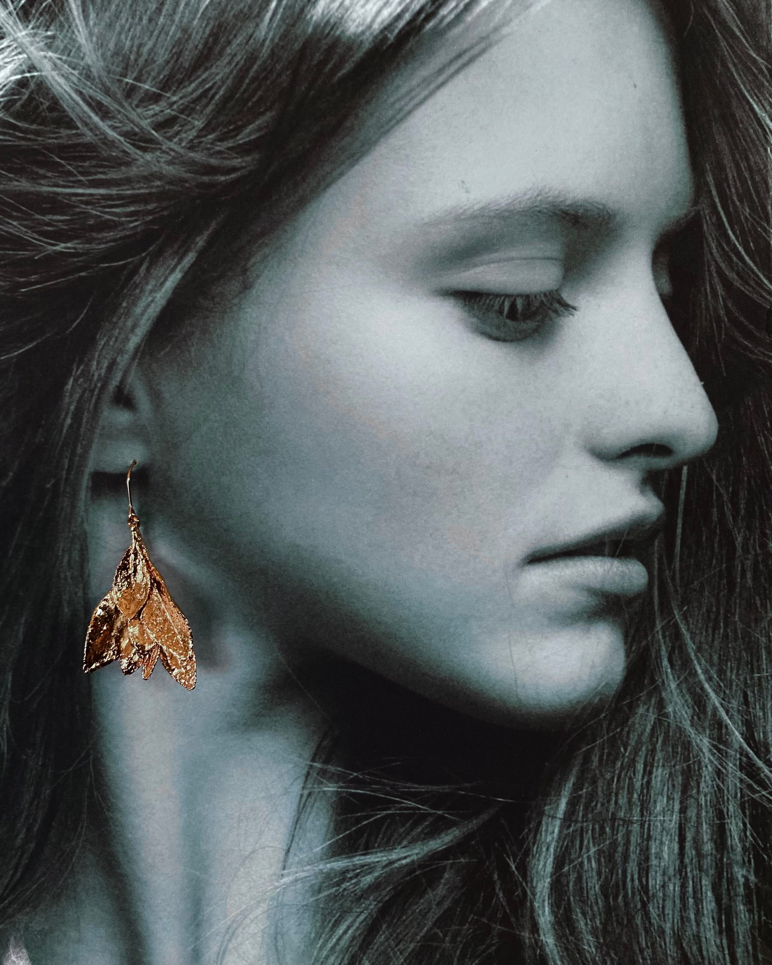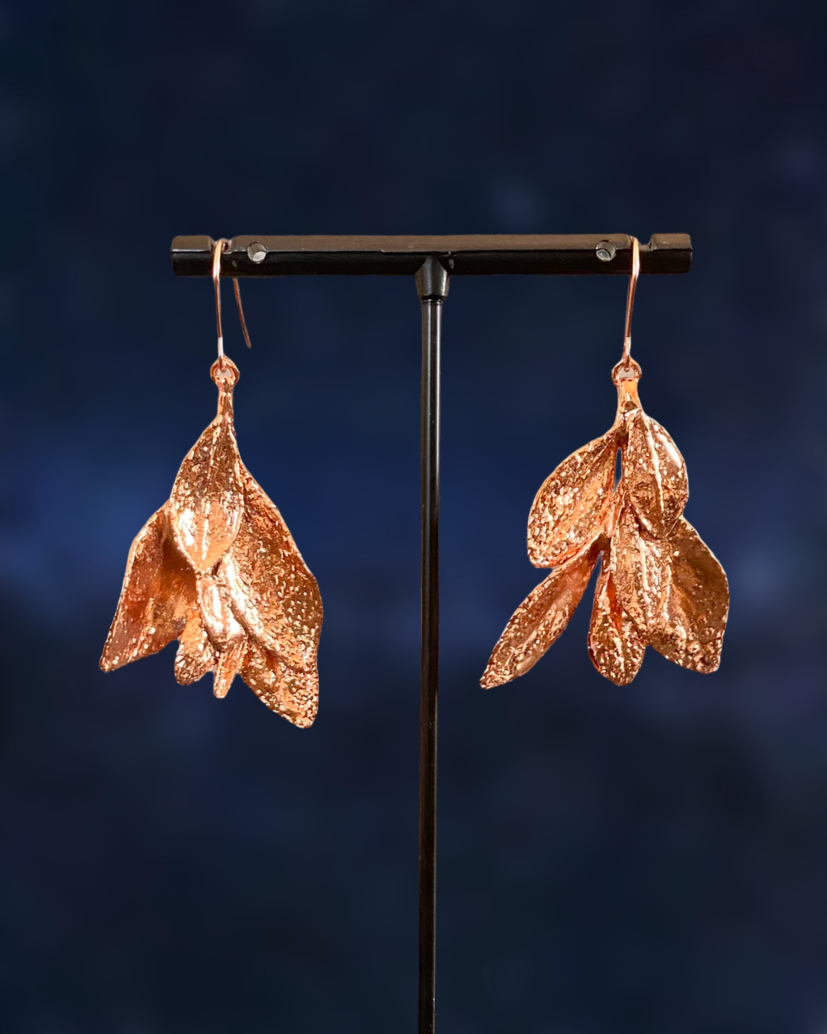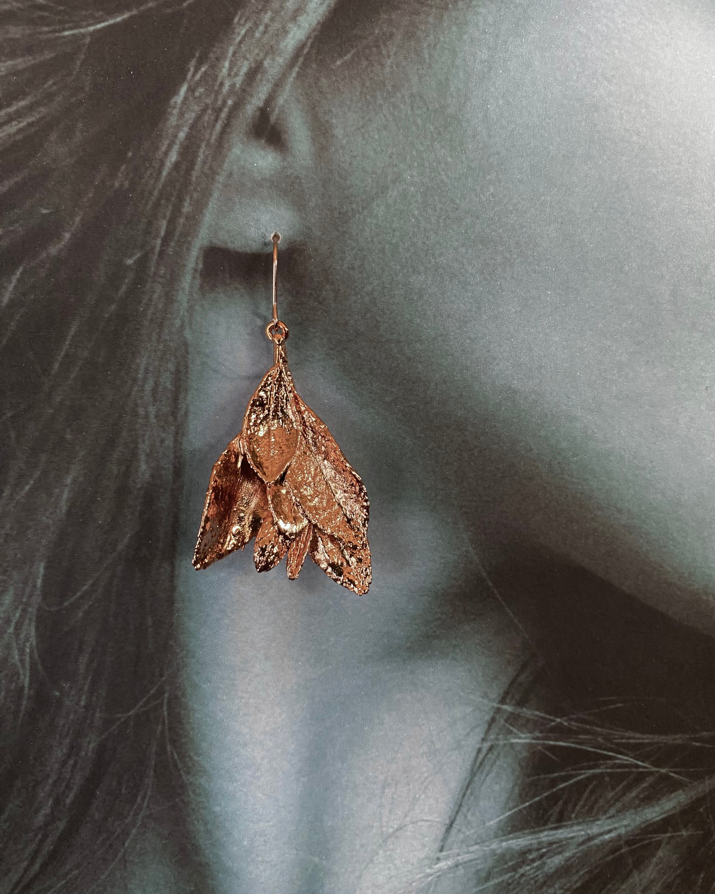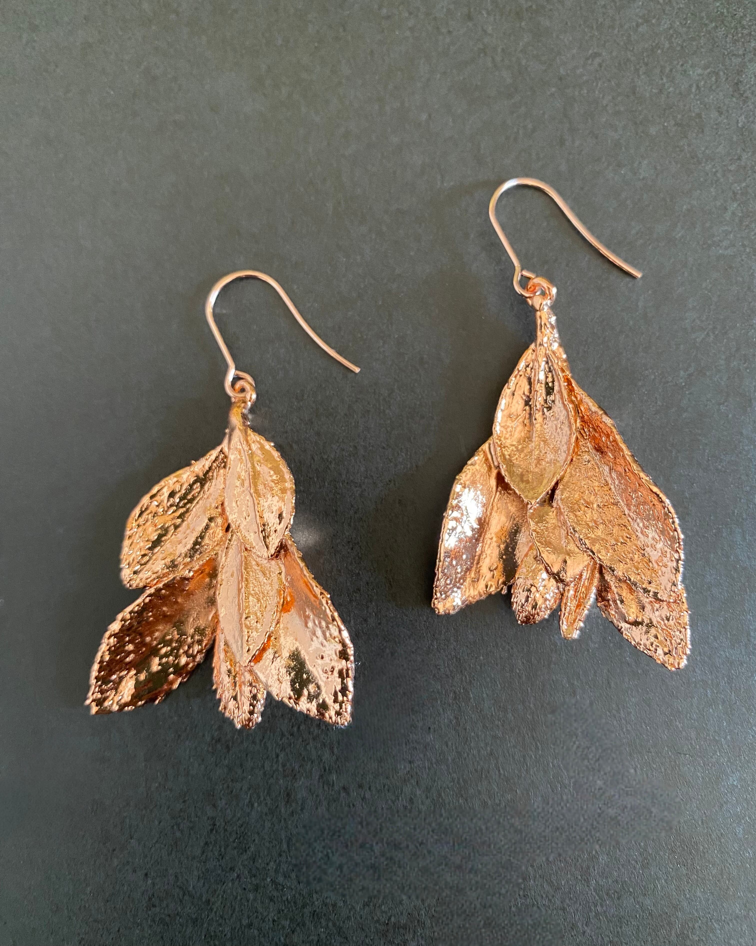 いく重にも折り重なるサツキの葉に、あたたかみのある銅のコーティングしたピアスです。