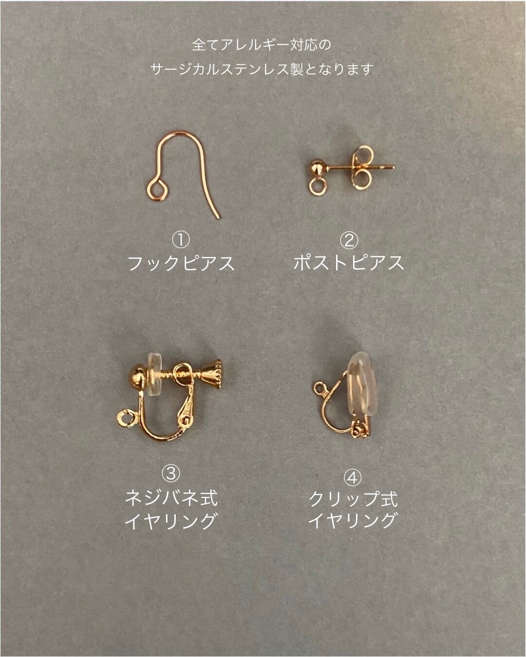 直接お肌に触れるピアス・イヤリングパーツはアレルギー反応が出にくいサージカルステンレスを使用しております。パーツの種類は下記からお選びいただけます。